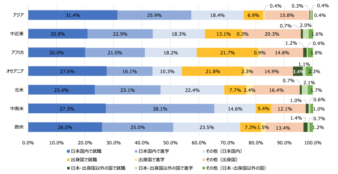 国内就職に限ったデータはないのですが、 国内就職と進学を合わせたデータは、中南米では65.4%、アジアでは57.3%、 欧州では51%という割合になっています。
