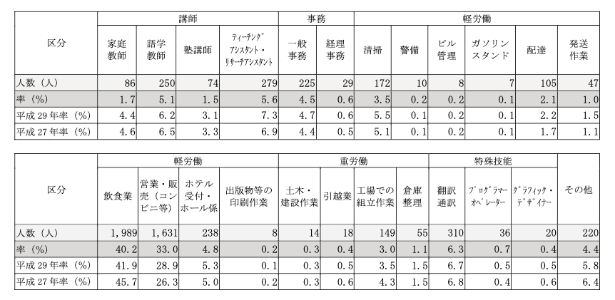 また、アルバイトの職種としては、飲食店が約40%、その他、営業販売、コンビニ等の仕事が33%、彼らの言語力を生かした通訳・翻訳が6%というような割合になっています。