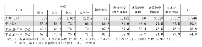 独立行政法人日本学生支援機構が発表しているデータによると、約留学生の半数以上の学生がアルバイトに従事していると回答しているようです。
