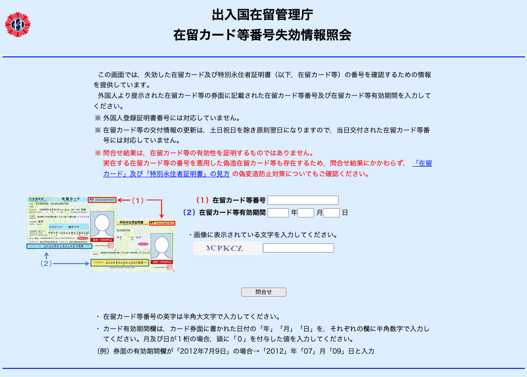法務省入国管理局のWebサービス「在留カード等番号失効情報照会」で、在留カードの照会を行うことができます。