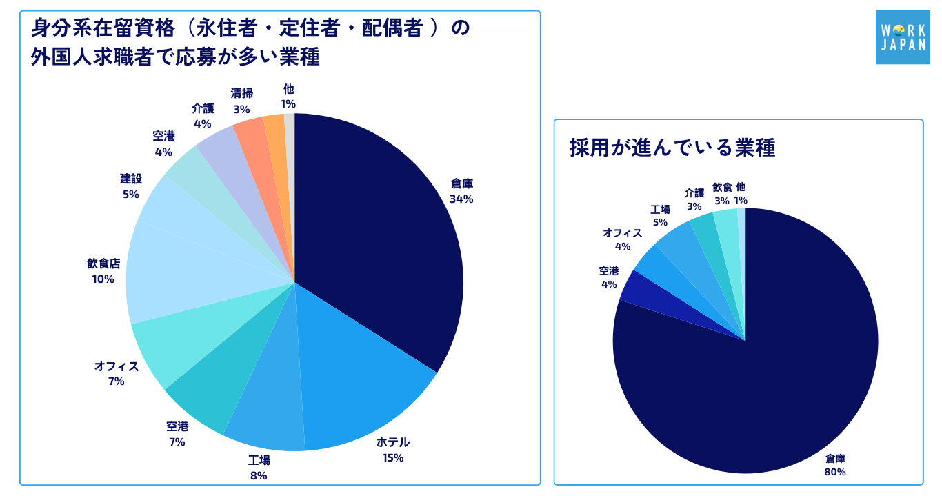 一方、実際の採用データを見ると、倉庫(80%)での採用が圧倒的に多く、倉庫作業は業務内容が明確であり、言語の壁が低いため、企業側も外国人求職者を受け入れやすいと考えられます。