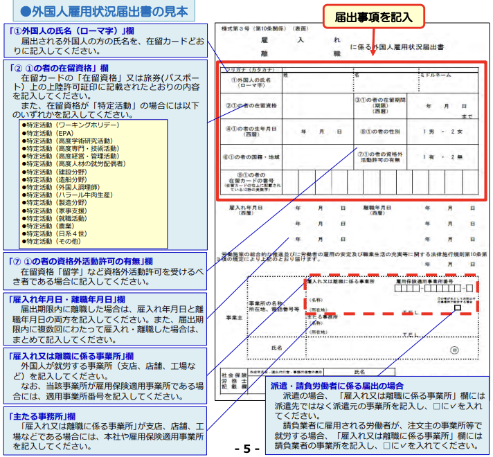| 届出事項 | 氏名 在留資格 在留期間 生年月日 性別 国籍・地域 資格外活動許可の有無 在留カード番号 雇入れ又は離職年月日 雇入れ又は離職に係る事業所の名称、所在地等 |