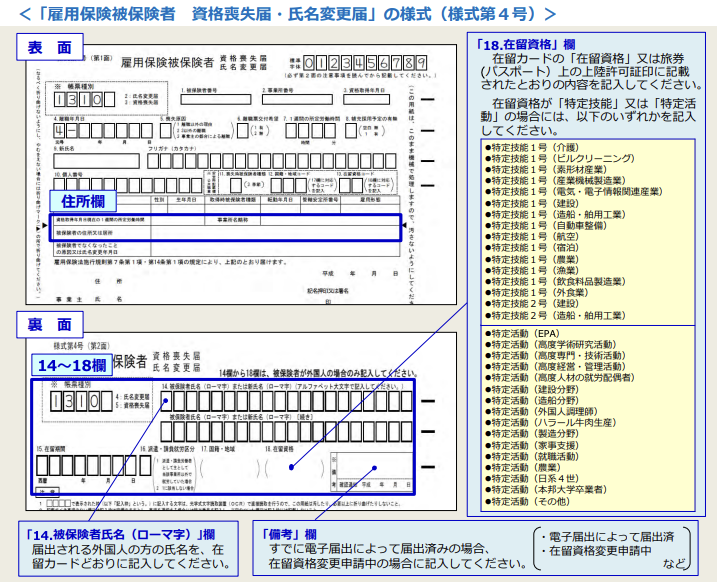 | 届出事項 | 氏名 在留資格 在留期間 生年月日 性別 国籍・地域 資格外活動許可の有無 在留カード番号 離職に係る事業所の名称及び所在地など、喪失届に記載が必要な事項 |